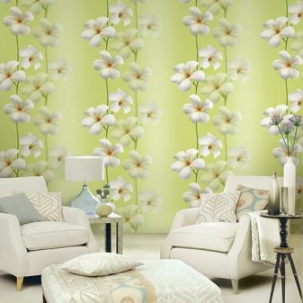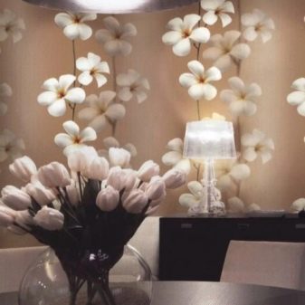 - “بيانوسا”. الزنابق الملكية ، ميداليات الزهور الدانتيل على ورق الحائط بألوان دافئة ستجعل أي غرفة مريحة. تتضمن المجموعة خلفيات ذات سطح لامع وغير لامع ، ومواد مختلفة.