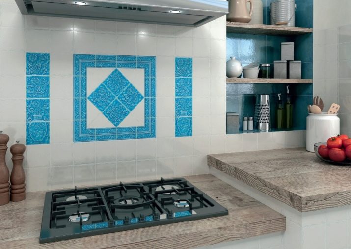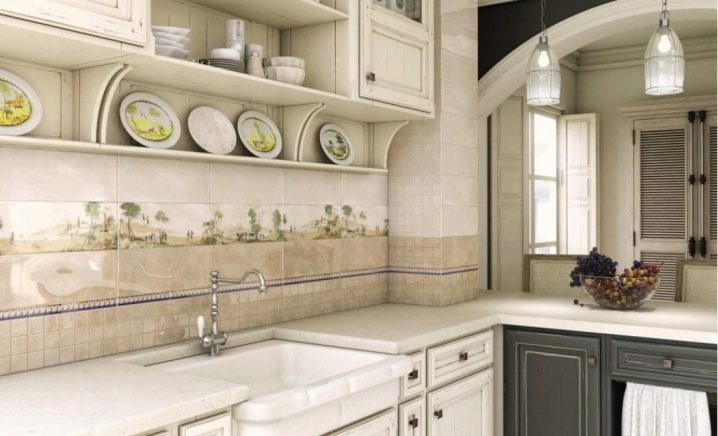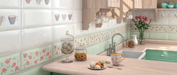 اعتمادًا على اتجاه النمط المختار ، يمكنك اختيار مجموعات العلامات التجارية. لتزيين المطبخ بأسلوب بروفانس يجدر إعطاء الأفضلية للسيراميك بظلال زرقاء وزرقاء.