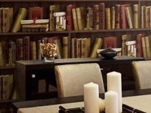 - فينيل أو ورق “مكتبة”. ستخلق مطبوعات الرف مع الكتب والموسوعات والأطالس جوًا لطيفًا. مثالي للمكاتب أو الحسابات الشخصية.