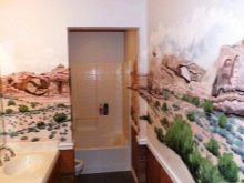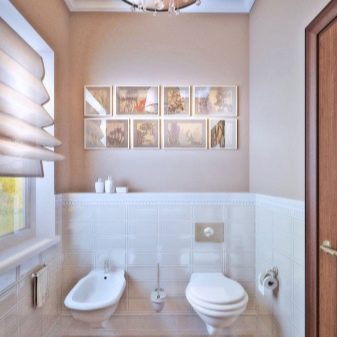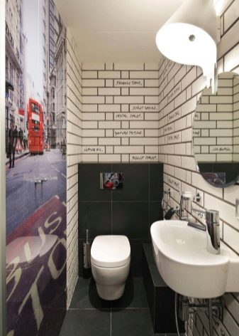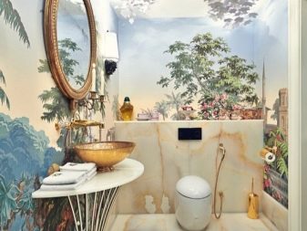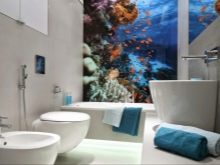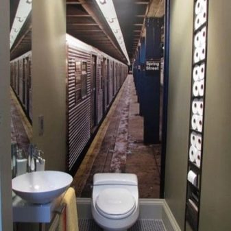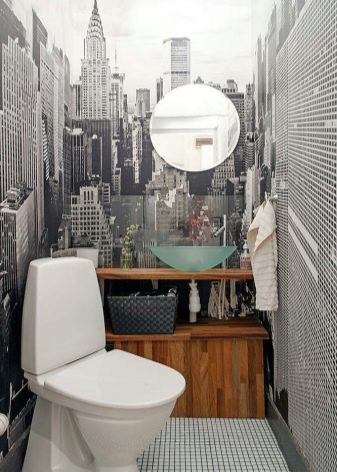 إذا تم الجمع بين المرحاض والحمام – فهذه ميزة إضافية كبيرة للتشطيب بورق حائط للصور ، لأن هذه الغرفة دائمًا ما تكون أكبر حجمًا ، وبالتالي ، ستكون هناك المزيد من الفرص للصور على ورق الحائط ، بالإضافة إلى مساحة للأفكار.