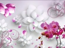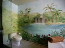 إذا كان إصدار ورق الحائط الكلاسيكي يبدو غير ممتع أو عفا عليه الزمن وتريد شيئًا أكثر أصالة ، فيمكنك عندئذٍ إعطاء الأفضلية لخلفية الصورة. استخدامها في الحمام ليس من غير المألوف. إنها سهلة التركيب ولها تصميم مثير للاهتمام. وفقًا للمخطط ، يقع الاختيار عادةً على الزهور أو الصور الطبيعية. إذا كان الحمام صغيرًا ، فمن الأفضل شراء ورق حائط للصور بنمط يوسع الغرفة بصريًا (على سبيل المثال ، صورة زهرة كبيرة أو حيوان).
