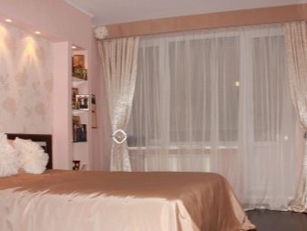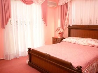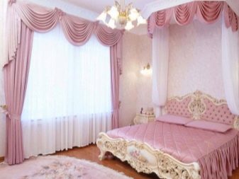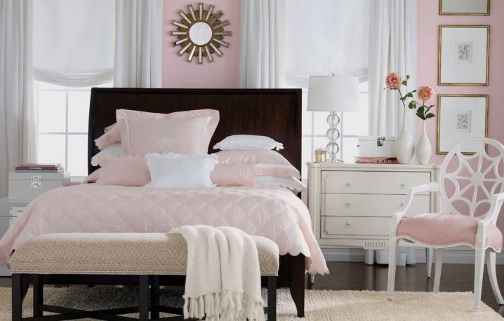 تعتبر الستائر البيضاء والجدران الوردية الباهتة مزيجًا رائعًا لإخفاء بعض العيوب وإبراز المزايا. يمكنك اختيار مجموعات لمطابقة. الألوان الناعمة للأثاث مناسبة لمثل هذه الغرفة. ستكون طاولات السرير البني في متناول اليد ، ويمكن أن تضيف سجادة أرجوانية لمسة مشرقة.