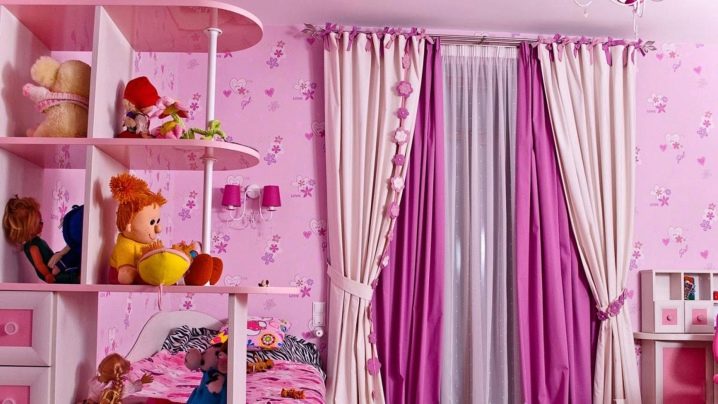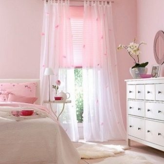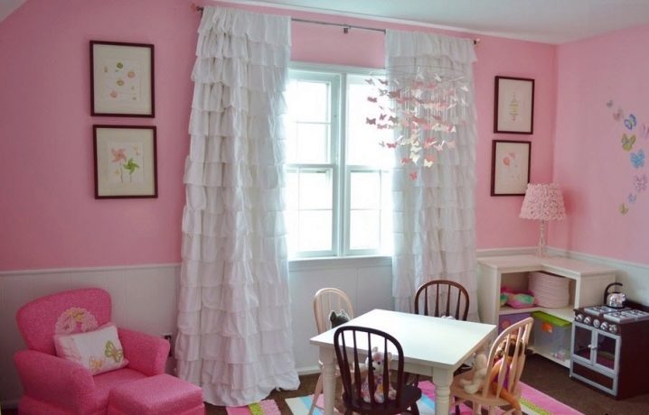 غالبًا ما تكون غرفة الفتاة مزينة باللون الوردي ، بغض النظر عن معايير الغرفة. تعتبر الستائر البيضاء خيارًا رائعًا لاستكمال التصميم بشيء خفيف وخفيف الوزن ، بحيث تتمتع الحضانة بجو رائع وأجواء فريدة..