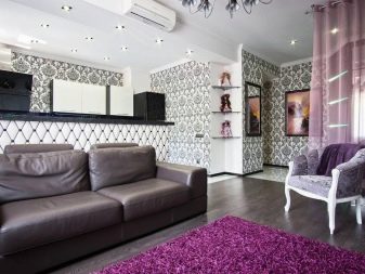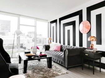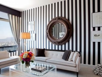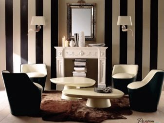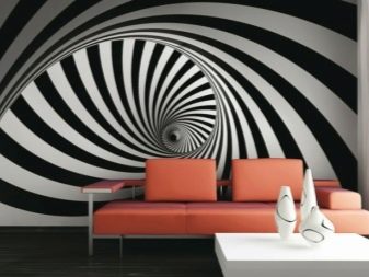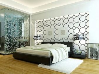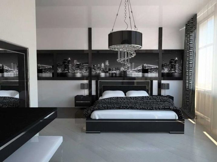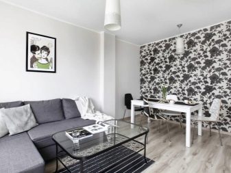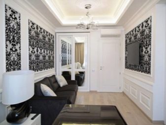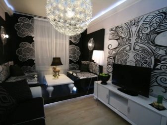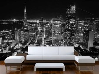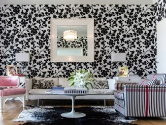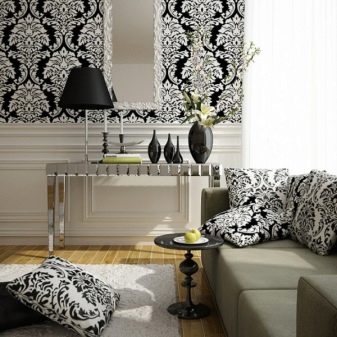 من الأفضل استخدام ورق الحائط الأسود أو الأسود والأبيض بنمط كبير لتزيين أحد الجدران الأربعة للغرفة. سيسمح لك ذلك بإبراز المجالات الوظيفية الرئيسية للغرفة بشكل إيجابي ، بالإضافة إلى التركيز على ميزات تصميم الشقة. بنفس الطريقة ، يمكنك التأكيد على أفضل التفاصيل الداخلية ، وتسليط الضوء على أهم المناطق – مرآة ، رف كتب ، تلفزيون ، أريكة أو سرير..