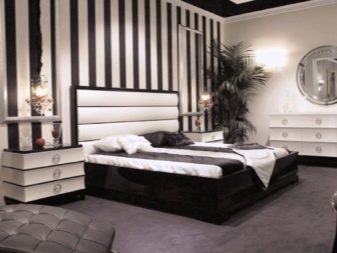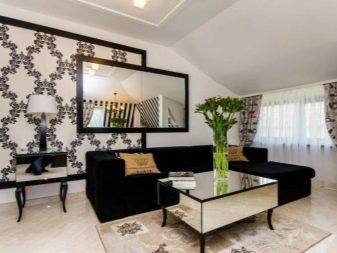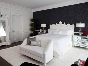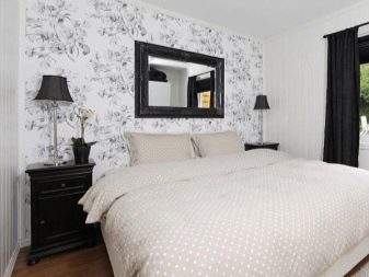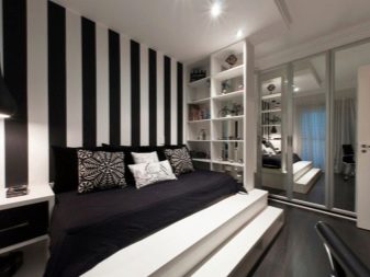 إذا تم إعطاء الأفضلية في الكسوة الجدارية لورق الحائط الأسود ، فسيكون من الأفضل في بعض الحالات اختيار أثاث أبيض متباين ، وفي حالات أخرى – لامعة ، مما يمنح الغرفة شعورًا بالأناقة والرفاهية. تبين أن الأثاث المزود بإدراج مرآة فعال للغاية في مثل هذه الظروف..
