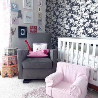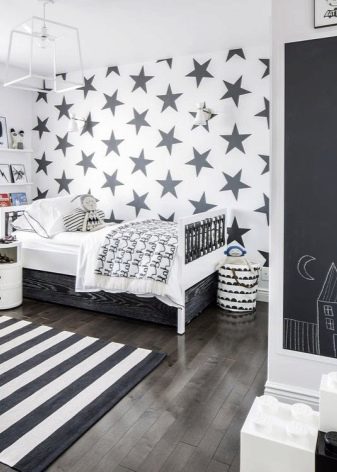 سيؤثر اللون الأسود والأبيض الهادئ المخفف ببقع من الألوان الزاهية (على سبيل المثال ، اللون الوردي في غرفة نوم الفتاة أو الأزرق في غرفة نوم الصبي) على الطفل مفعول مريح ، يلطف ولا يهيج العيون بوفرة من الألوان الزاهية.