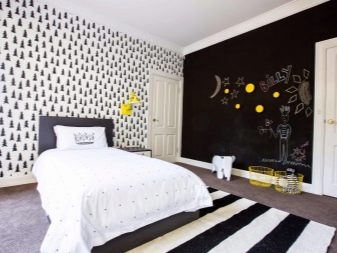 لا يكاد يوجد رفيقان أفضل من الأسود والأبيض. كما يتم دمجها بشكل مثالي مع بعضها البعض في تصميم جدران الغرفة. اعتمادًا على غلبة لون معين ، يتم إنشاء جو ومزاج معين في الغرفة..