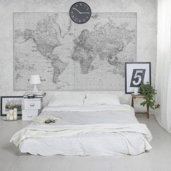 في غرفة النوم الحديثة ، تبدو الصور ذات المناظر الطبيعية الرائعة مع إطلالات على مدينة ليلية أو قمة جبلية أو غابة: ثلجي أو غابة داكنة أو مرج صافٍ. ستبدو خريطة العالم بالأبيض والأسود مثيرة للاهتمام – خاصةً إذا قمت بتنويع المناطق الداخلية بتفاصيل “جغرافية” أخرى.
