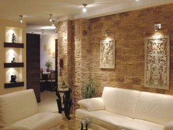 إذا كانت ورق الجدران الجبس لا “تستجيب” لأشعة الضوء وحتى تمتص الضوء ، فإن الحجر الرملي ورقائق الحجر يلعبان في جميع الظلال تحت الضوء الاصطناعي والطبيعي. إذا تم استخدام الإضاءة الخلفية في الداخل ، فستبدو هذه الخلفيات أيضًا مفيدة للغاية..