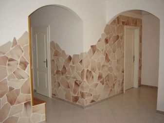 نوع آخر مثير للاهتمام من البلاط ، والذي يحتوي على لوحة كبيرة من الظلال من الضوء إلى الظلام. بمساعدتها ، يمكنك تطوير خيارات تصميم مختلفة ، على الرغم من أنه من الأفضل دمجها مع عناصر أخرى. ستبدو الغرفة الحجرية بالكامل قاتمة. إذا كان أحد الجدران مصنوعًا ليبدو كالحجر البري ، فيمكن جعل البعض الآخر خفيفًا.