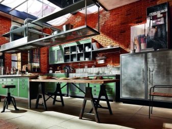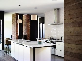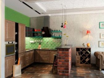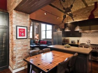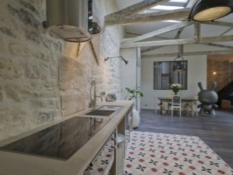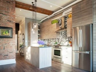 بمساعدة مثل هذا البلاط ، يمكنك فصل مناطق تناول الطعام والعمل بشكل غير محسوس تقريبًا. يبدو سطح العمل جيدًا بالطوب أو البناء ، والذي غالبًا ما يكتمل بالعناصر والتجهيزات الزخرفية المعدنية. في منطقة تناول الطعام ، يعد استخدام الخشب مناسبًا ، لأن هذه المادة تعطي اكتمال الصورة وتتيح لك خلق جو مريح. الأقسام الفردية من الجدران مطلية بالطلاء وتعمل كعنصر محايد. الحدود بين المنطقتين عبارة عن طاولة بار أو جزيرة مطبخ ، والتي تنطبق أيضًا على طراز الدور العلوي.