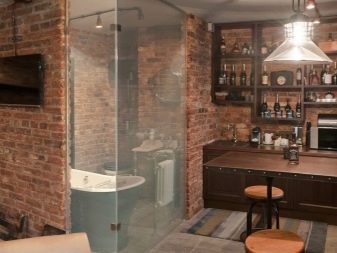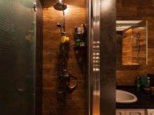 معظم الغرفة عبارة عن لون أو لونين يتناسبان بشكل جيد مع بعضهما البعض. مجموعة متنوعة من الألوان مقبولة لخلق لهجة ، على سبيل المثال ، في منطقة كشك الاستحمام. في نفس الوقت ، بأسلوب الدور العلوي ، فهو مصنوع من الزجاج الصلب ، وهو مدعوم بعناصر معدنية..