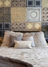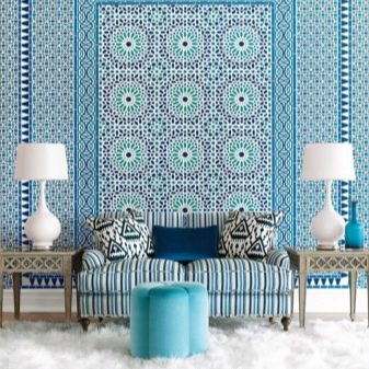 الأرضيات المبلطة في غرفة النوم أو غرفة المعيشة ليست هي الحل الأكثر شيوعًا ؛ هذا يجعل مثل هذا التصميم يبدو أكثر غرابة. في الغرف ، يمكن تزيين أجزاء من الجدار بالبلاط المغربي ، وتقسيم المساحة. على سبيل المثال ، يمكنك فصل منطقة الجلوس عن منطقة تناول الطعام..