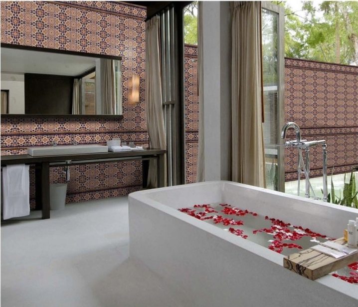 تقليديا ، يتم استخدام البلاط ذي الأنماط المتماثلة أو المتكررة لتزيين الجدران.. ستحتوي الأرضية على سجادة من البلاط ذات دوامات ملتوية أو نمط بديل. في الشقق ، يمكنك بلاط حوض الاستحمام أو إنشاء زخرفة متدرجة ، والتي ستجعل السباكة بصريًا تتحلل حرفيًا في الداخل..