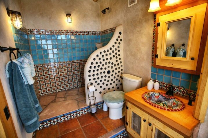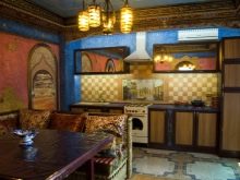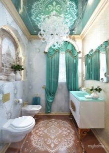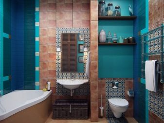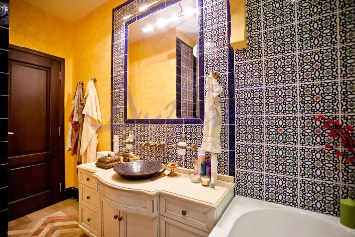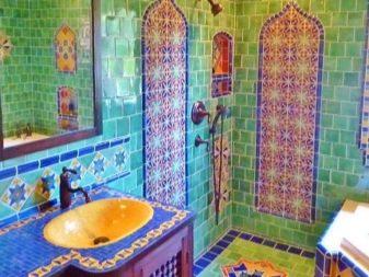 يمكنك تزيين الحمام بنفس طريقة تزيين المطبخ ، لكن الألوان الباردة ستكون أكثر ملاءمة فيه. هنا الديكور على الطراز الشرقي سيبدو أصليًا وعقلانيًا..