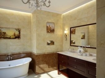- لوحة بيج مناسب لتزيين الحمامات أو الغرف الأخرى بأسلوب كلاسيكي. الأرضية مزينة بشكل جميل ببلاط بني مع عروق ذهبية. يمكن استكمال التصميم بمرايا ذات إطار معدني وصنابير وتركيبات ذهبية.