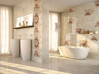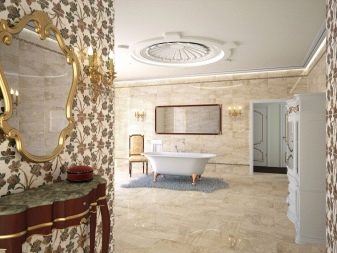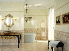 - لوحة بيج مناسب لتزيين الحمامات أو الغرف الأخرى بأسلوب كلاسيكي. الأرضية مزينة بشكل جميل ببلاط بني مع عروق ذهبية. يمكن استكمال التصميم بمرايا ذات إطار معدني وصنابير وتركيبات ذهبية.
