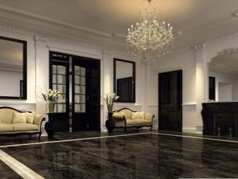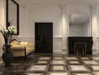 - في تصميم الأرضية ، يجب ألا تخاف من الظلال غير التقليدية. على سبيل المثال ، سوف يضيء الرخام الفيروزي الداكن غرفة المعيشة الكلاسيكية الجديدة. ستلعب الجدران الخفيفة والأثاث المتقن بطريقة جديدة مع الظل النبيل والديكور المثير للاهتمام في وسط الغرفة. وهكذا تصبح الأرضية عنصرًا مركزيًا في ديكور الغرفة..