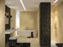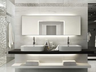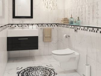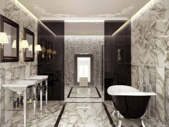- عظم لون الرخام العالمي – أبيض, يمكن أن يصبح أساسًا للداخلية الأحادية. والنتيجة هي تصميم خفيف الوزن وخفيف الوزن ، والذي ، إذا رغبت في ذلك ، يمكن استكماله بسهولة بإكسسوارات مشرقة ، مما يمنحها مزاجًا مختلفًا. ستؤكد النغمة الفاتحة تمامًا على اللون الأسود لتزيين الجدران في المناطق الداخلية عالية التقنية. من الأفضل استخدام القوام اللامع والحنفيات المعدنية الأنيقة على تركيبات السباكة والمرايا غير العادية والمصابيح المدمجة الصارمة في السقف. سيجد أيضًا أحادي اللون وشدة الجمع بين هذين الظلالين استخدامًا ممتازًا في أسلوب التبسيط..