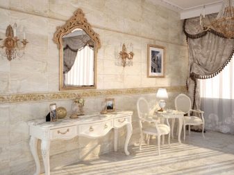 - الرخام الطبيعي أو تقليده لا يسمح للأثاث بالتكتل في الغرفة. يجب أن تكون الزخرفة مرئية بوضوح ، وإلا ستبدو الغرفة مزدحمة ومثقلة وقذرة..