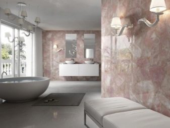 - سوف يؤكد النمط الرومانسي للحمامات الأنثوية بلاط رخام وردي مع الأبيض والفضي.