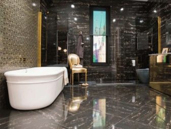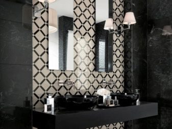 - وفرة رخام أسود في الحمام الكبير ، سيكون أساسًا ممتازًا لتصميم نوير أو قوطي. سيتم دعم تأثير القلعة الغامضة من خلال الشمعدانات التي تقلد الشموع والدانتيل المعدني الأسود من إطارات المرآة والأثاث المعدني على الأرجل الملتوية..