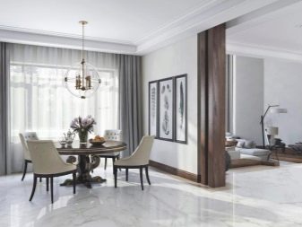- لا يمكن لغرفة المعيشة الكلاسيكية التقليدية الاستغناء عن البلاط الرخامي في مربعات منفصلة. تساعد الخطوط الواضحة والظلال الهادئة من الأسود والبني والأبيض على الهدوء والتركيز والاسترخاء المريح. يسمح لك حجم الغرفة “بالتنفس بحرية” في مثل هذه الغرفة الأنيقة والمقتضبة.