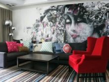 - لا يقتصر على موضوع الطباعة ، والذي يسمح لك باستخدام ورق الحائط كعنصر لتزيين المساحة ، والتي من خلالها يمكنك جلب الفردية والجو المطلوب إلى القاعة ؛