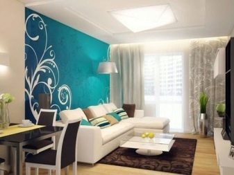 بالنسبة لغرفة المعيشة الصغيرة ، فإن ورق الحائط بنمط متوسط الحجم أفضل. إنه لأمر جيد إذا لم يكن الرسم واضحًا: الخطوط ، الموجات ، الطباعة الحريرية هي أفضل التقنيات لتزيين مساحة صغيرة. يمكن القيام بذلك أيضًا عن طريق الملمس: غالبًا ما يكون لها تأثير أفضل من الزهور الضخمة أو الزخرفة الوطنية..
