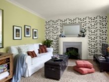 أسلوب تقسيم القاعة الأكثر شيوعًا هو الخيار باستخدام لهجة صغيرة. في الوقت نفسه ، يتم وضع ورق الحائط المطبوع في مكان معين لا يغطيه الأثاث.. يتم النظر بعناية في حجم اللكنة: يمكن وضعها في وسط الجدار ، وإبراز زاوية معينة ، والنتوء ، وتسليط الضوء على الطائرة متعددة المستويات. في كثير من الأحيان ، تشبه ورق الحائط المطبوع اللوحات إذا كانت اللكنة مؤطرة بإطار خاص باستخدام القوالب أو الرغيف الفرنسي أو قاعدة السقف.