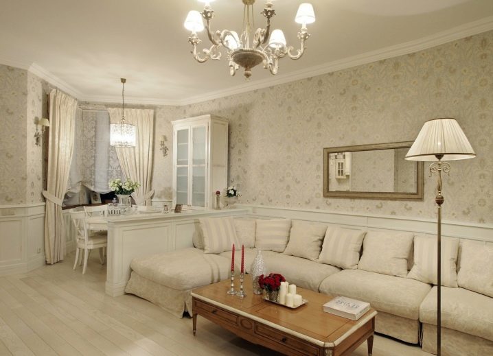 في الواقع ، يشبه الطراز الكلاسيكي الكلاسيكية ، التي أضافت ملاحظات ريترو وبروفانس ، لكنها مرتبطة بعصر معين. بالإضافة إلى اللوحات أحادية اللون ، يُسمح بطباعة على شكل شريط ، ونمط زهري بسيط ، ونسيج للجص الزخرفي.