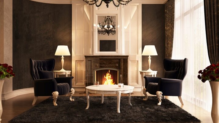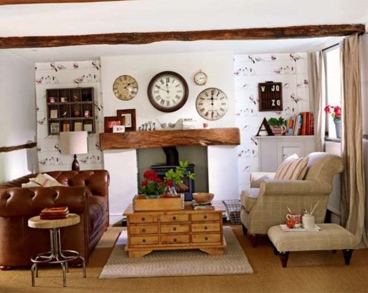 - إذا كانت مساحة الغرفة صغيرة ، وتحتوي على جدار به مدفأة على شكل حافة ، فإن الأمر يستحق لصق ورق حائط فاتح بنمط على الحافة البعيدة على جانبي الحافة ، ووضع الأثاث باللون البني والبيج نغمات بالقرب من منطقة الضيف ، قم بتعليق الساعة فوق المدفأة.