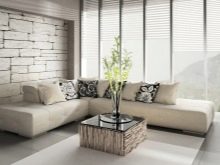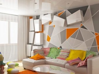 - تبدو الخلفية الصارمة ذات النمط الهندسي بألوان محايدة رائعة في المناطق الداخلية الحديثة لغرفة المعيشة: فهي تبرز بشكل إيجابي على خلفية الزخرفة أحادية اللون للغرفة ، وتمنحها الراحة ، وتزيل الإيجاز غير الضروري للمفروشات ، ويكملها رف مع التماثيل وصورة غير عادية ؛