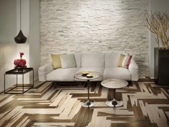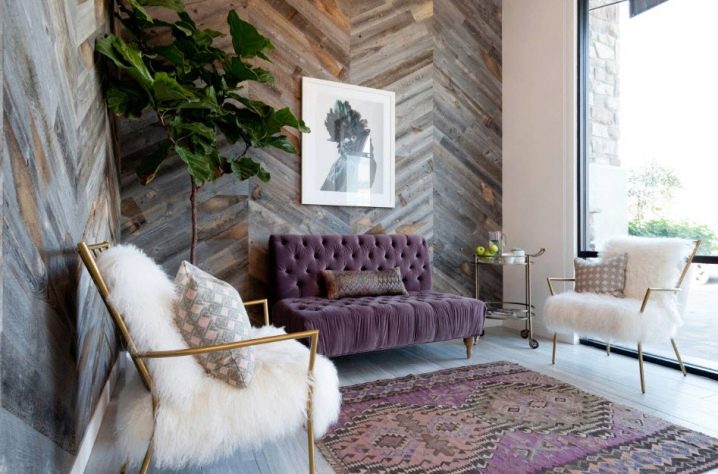 - يمكنك تزيين جدران غرفة المعيشة بورق حائط يقلد الباركيه بدرجات اللون الرمادي والبني ، وموضوعة في شكل متعرج: للحصول على مظهر متناغم ، يكفي لصقها على جدارين بجوار نافذة عريضة ، واستكمال المفروشات بأثاث أبيض وأرجواني ، أرضيات مبيضة ، سجادة مع زخرفة تتناسب مع الأريكة المشرقة والخضراء النابضة بالحياة ؛