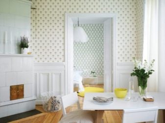 فيما يتعلق بمواد ورق الحائط ، انتبه إلى المنسوجات غير المنسوجة والأصناف السائلة والألياف الزجاجية. قم بالاختيار لصالح أولئك الذين يتناسبون مع درجة التآكل والتطبيق العملي. إذا لزم الأمر ، اجمع بين المواد مع بعضها البعض. هذا سيجعل التصميم الداخلي فريدًا. تسمح تقنية التصميم بترتيب ورق الحائط السائل وورق الحائط غير المنسوج ، إذا تم فصله عن بعضهما البعض بواسطة القوالب أو الرصيف أو قاعدة السقف.