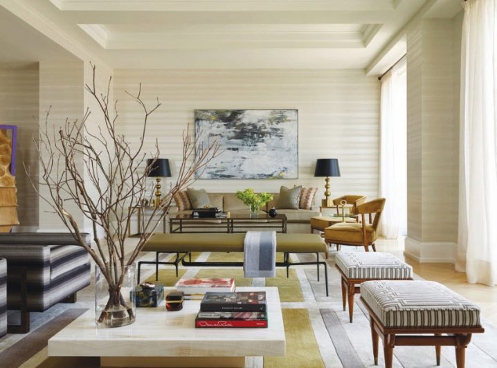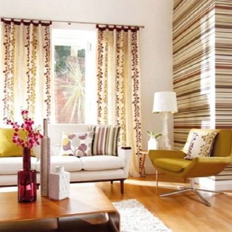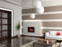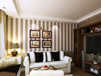 - يبدو اللصق الأفقي رائعًا بسبب الملمس غير العادي والنمط المخطط الخافت: يمكن لورق الحائط البيج الرقيق أن يزيد بصريًا من ارتفاع الجدران ، ويزين جميع جدران غرفة المعيشة ويكمله الأثاث باللون البني والخردل ، وكراسي بذراعين أحادية اللون متناقضة وغير عادية الصورة والستائر البيضاء والسكتات الدماغية السوداء في شكل مصابيح أرضية ودعامات أثاث ؛