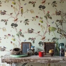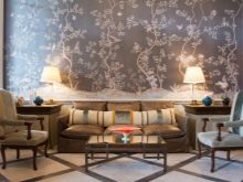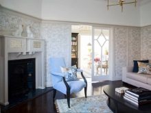 - يمكنك إبراز جدار غرفة المعيشة من خلال الجمع بين ورق الحائط الفاتح العادي والتباين في درجات اللون الرمادي مع نمط من فروع ساكورا وطيور الجنة ، ووضع نمط لوني على جانبي مدخل جدار واحد (لإضافة البهجة إلى الجو ، أنت بحاجة إلى إضافة أثاث بألوان بنية ورملية ، وسجاد مع زخارف ووسائد زخرفية متعددة الألوان باللون الفيروزي والأبيض والظلال الوردية الباهتة) ؛