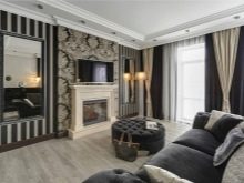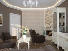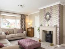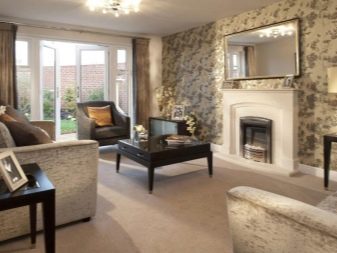 - إذا كانت مساحة الغرفة صغيرة ، وتحتوي على جدار به مدفأة على شكل حافة ، فإن الأمر يستحق لصق ورق حائط فاتح بنمط على الحافة البعيدة على جانبي الحافة ، ووضع الأثاث باللون البني والبيج نغمات بالقرب من منطقة الضيف ، قم بتعليق الساعة فوق المدفأة.