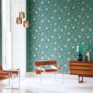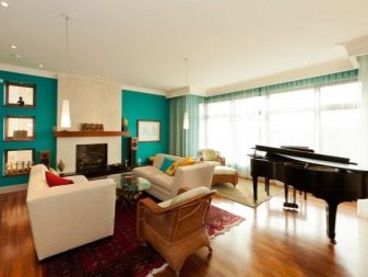 - سيساعد الطراز العتيق في إنشاء ورق حائط مقترن بألوان فيروزية عصرية: يمكن تزيين جدار واحد بلوحات قماشية بنمط على خلفية بيضاء ، وفي نفس الوقت تغلب على منطقة المدفأة مع رفيق أحادي اللون بنبرة غنية من خلال تعليق أرفف بيضاء صغيرة عليها هذه الطائرة ، تضيف أثاثًا مع تنجيد نسيج خفيف إلى الديكور وتدعم ورق الحائط بظلال لتتناسب معه ؛