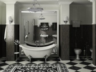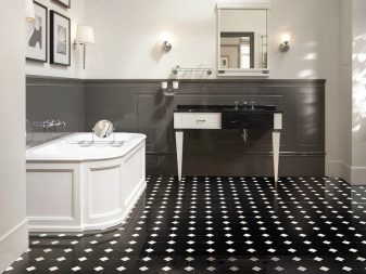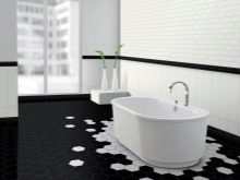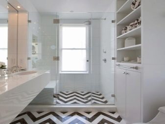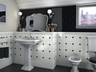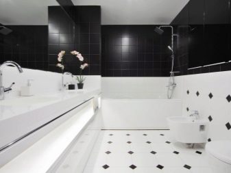 بالنسبة للحمامات ، يوصى باختيار اللون الأبيض بنقوش سوداء ، ثم سيبدو تصميم الغرفة أنيقًا للغاية. إذا كانت الغرفة ضيقة ، فيجب وضع البلاط بشكل قطري في مربعات. هذه التقنية ستزيد المساحة بصريًا..