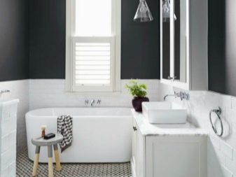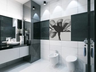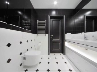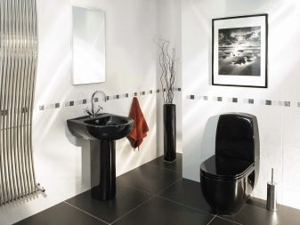 يتيح لك استخدام المواد بالأبيض والأسود في الحمام جعل الغرفة أنيقة ومبتكرة. بالنسبة للحمامات الصغيرة الحجم ، فإن الكسوة البيضاء اللامعة مع ملحقات سوداء صغيرة مناسبة. سيؤدي التشطيب الخفيف إلى توسيع المساحة بصريًا. لا يُسمح بعدد كبير من البقع ذات اللون الداكن إلا في الغرف الفسيحة.