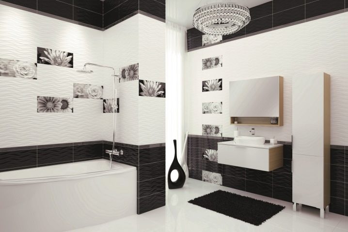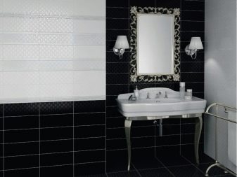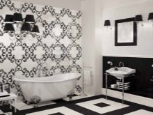 أفكار التصميم باستخدام بلاط دياكروم لا حصر لها. لذلك يمكن تزيين الجدران باللونين الأبيض والأسود بنسبة 3: 1. يمكن تزيين السطح المقابل لمدخل الحمام بملصقات مقاومة للرطوبة أو بلاط مزخرف. سيتم صقل الحمام بالبلاط الأبيض مع تصاميم الأزهار أو الأزهار الداكنة. بالنسبة للحدود ، يوصي المصممون باستخدام الألوان الفضية أو السوداء..