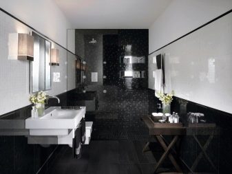 لتعويض الحجم غير الكافي للغرفة وإخفاء العيوب في التصميم ، يمكنك استخدام تصميم متعرج. إذا تم استبدال اللون الأبيض للبلاط بظل حليبي ، فلن يكون تباين الطلاء حادًا. ستبدو الغرفة المكسوة بالبلاط الأسود والقشدي أكثر نعومة. إذا كان من المفترض استخدام البلاط في الغرفة كغطاء للجدران والأرضيات ، فمن الضروري تحديد هذه الأسطح باستخدام أنماط أو مواد مختلفة. على سبيل المثال ، يمكن وضع الأرضية باستخدام المعينات ، ويمكن تقليد البناء بالطوب على الجدران..