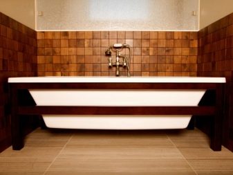 في حوض الاستحمام ذي الطراز العرقي ، يمكن أن تتداخل الأرضيات الخشبية مع حوض مصنوع من نفس المادة.
