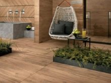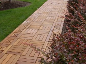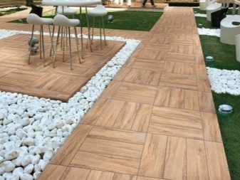 سيبدو البلاط الخشبي جيدًا ليس فقط في الداخل ، ولكن أيضًا في تصميم المناظر الطبيعية للموقع. الطلاء الزخرفي بمختلف الأشكال والأنواع مناسب لرصف الأرصفة.