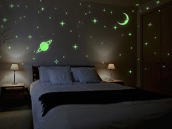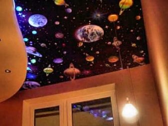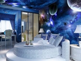 يمكن وضع موضوع الفضاء ليس فقط على الجدران ، ولكن أيضًا على السقف. الكواكب الغامضة والضباب والسماء المرصعة بالنجوم والسفن السماوية وعناصر أخرى مماثلة شائعة. يمكن أن يغير هذا الاتجاه بصريًا تصور الغرفة ، مما يجعلها جسيمًا لمجرة نجمية لا نهاية لها. ستبتلعك أمواج الفضاء وتسمح لك بالاسترخاء والاستمتاع بالأجواء الخاصة.