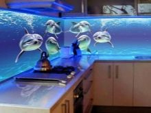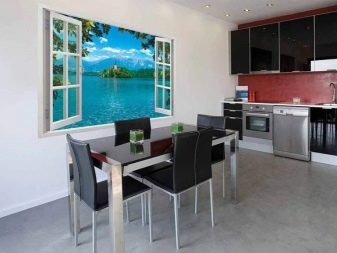 ستبدو الصور المطلة من النافذة أصلية في مطبخ صغير. سيساعد هذا النمط على زيادة مساحة الغرفة بصريًا. يوصي العديد من المصممين باستخدام اللوحات الثابتة واللوحات الجدارية المختلفة. يمكنك تزيين مثل هذا القماش بإطار بإضاءة خلفية لمنح مطبخك تصميمًا داخليًا فريدًا. يمكنك أيضًا استخدام الأنماط الهندسية.