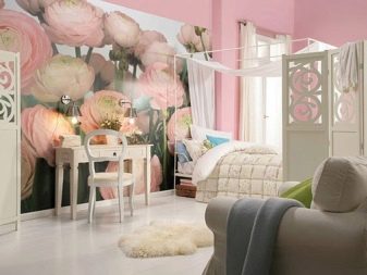 لمثل هذه الغرفة ، لا ينصح باختيار نغمات متناقضة للغاية ، لأنها ستنخفض. ضع في اعتبارك ألوان الباستيل التي ستندمج مع باقي الأسطح. سيكون من المناسب وضع صور ثلاثية الأبعاد مع أزهار على الجدران. يمكن أن تكون زهرة الأوركيد الوحيدة في منطقة النوم أو الورود الجميلة أو الزنابق أو صورة الفاونيا. يفضل بعض الناس الساكورا ، مما سيساعد في خلق جو هادئ وسلمي..