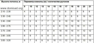 عند التجفيف ، يمكن أن تنحرف المادة ، مما يفسد المظهر المتجانس الخالي من العيوب لغطاء الجدار. بعد الاطلاع على البيانات الجدولية ، يتم تحديد المقدار المطلوب حسب ارتفاع السقف ومحيط الغرفة. يرجى ملاحظة أن هذه الارتفاعات تختلف بمقدار 15 سم: وهذا يعني أنه من غير العملي إعادة المواد إلى الوراء ، فأنت بحاجة إلى هامش صغير. في كثير من الأحيان ، لا تتم الإصلاحات فور الشراء ، ولن يكون من السهل اختيار ورق الحائط المناسب لاحقًا ، لأن كل دفعة تختلف في الظل وتشبع النموذج.