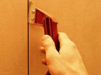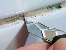- خذ حذاء أو سكين طلاء في يدك ، قم بتشغيل الشريط على طول خط التماس الذي يتطلب تجريدًا ، قدر الإمكان ، يُنصح بقطعه تمامًا.